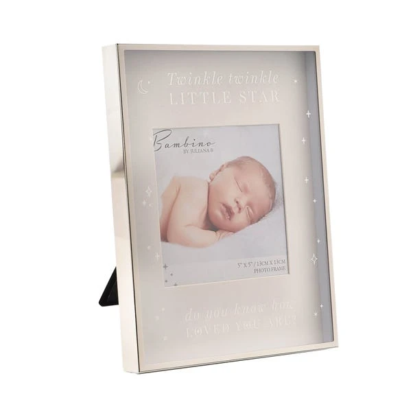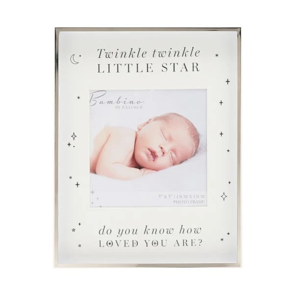 A steel photo frame from BAMBINO BY JULIANA®. This exquisite frame is an optimal way to beautifully present the photograph of new family arrivals. It features finished steel and square aperture, enhanced by silver detailing, including ‘Twinkle twinkle little star’ wording. The rear attachments offer the option of either standing the frame upright or hanging it on the wall. The frame is packaged in a Bambino closed gift box.