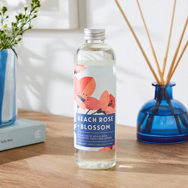 Add a fresh, floral scent to your home with this gorgeous diffuser refill, designed to brighten any space. The uplifting fragrance blends sparkling ozonic notes with the delicate floral scent of sun-kissed beach rose, while soft pink pepper combines with sweet peony and jasmine for a truly luxurious fragrance. This 250ml diffuser refill is designed to reinvigorate your favourite empty diffuser – perfect for adding a touch of luxury to your home.