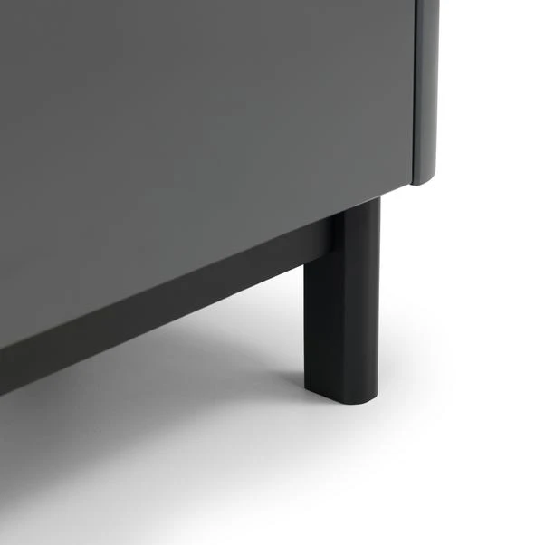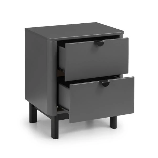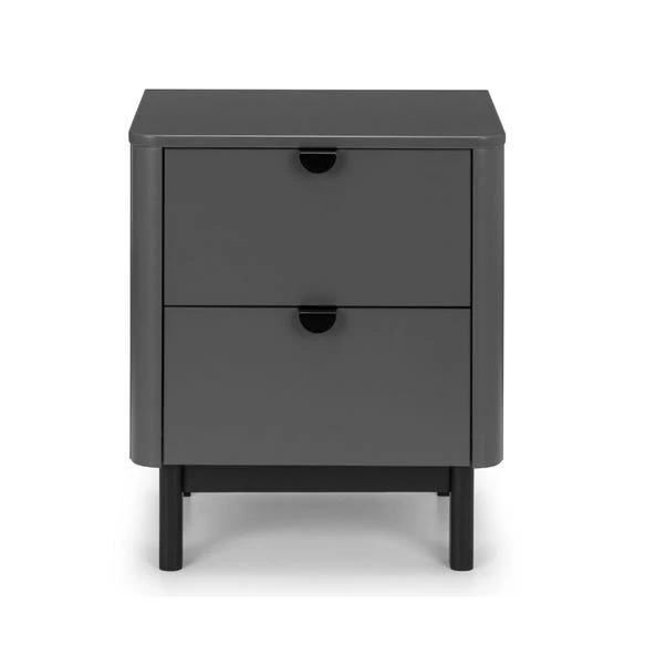 The perfect place to keep your glasses, snacks, and stack the books you’ll need to get through your last nightcap. Give your nighttime essentials a place to rest with this bedside table. Offering a modern and sophisticated look with a storm grey finish with black accents and rounded corners, perfect for any home.