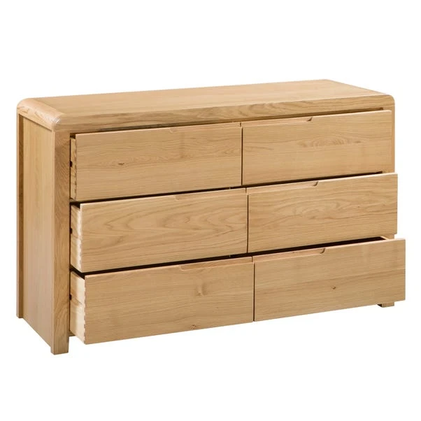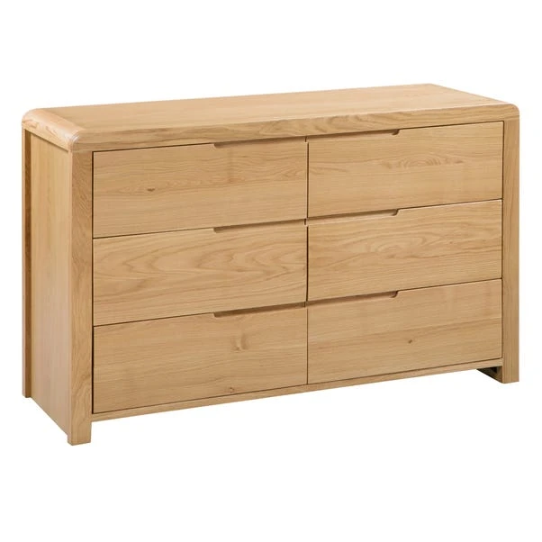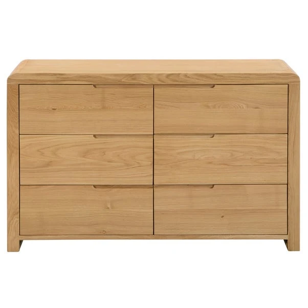 Crafted from solid oak & oak veneers, this chest of drawers is the perfect combination of classic and contemporary. With beautiful recessed handles and curved edging this chest of drawers is stunning. With 6 drawers this chest of drawers is perfect for holding all your clothes. Other matching furniture is also available.