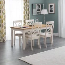 Crafted from solid rubberwood and a real oiled oak veneer 25mm top, this extending table is not only classic and modern but it is extremely durable. Perfect for any home, this table has an ivory lacquered finish. Other matching furniture is also available.