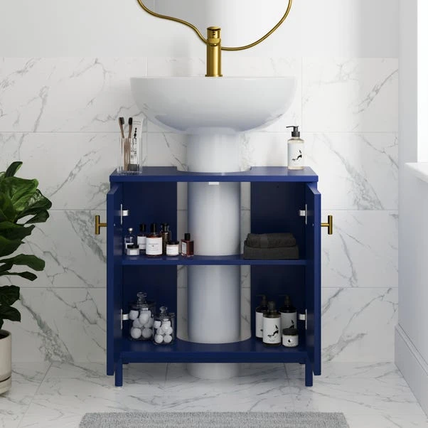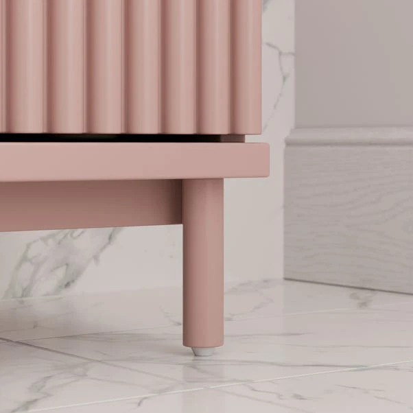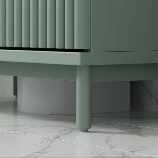 This unit is equipped with soft-closing doors and hinges for a touch of luxury and safety. Its modern fluted texture front, matte painted finish, metal leg base, and hexagonal handles create a chic and contemporary look, while the adjustable internal shelf provides customizable storage options.