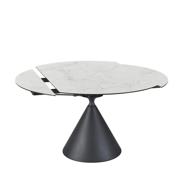 This well-balanced dining set brings together sculptural design and smart practicality. The round ceramic tabletop showcases a marble-effect finish, supported by a bold conical base that adds presence without overpowering the room. The real showpiece, though, is the smooth extension function that expands the table from 80cm to 130cm, offering flexibility for guests or larger meals. It’s paired with four aura chairs, upholstered for comfort and subtly curved for a relaxed feel.