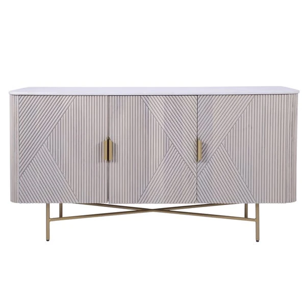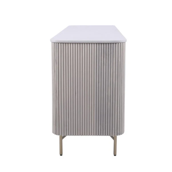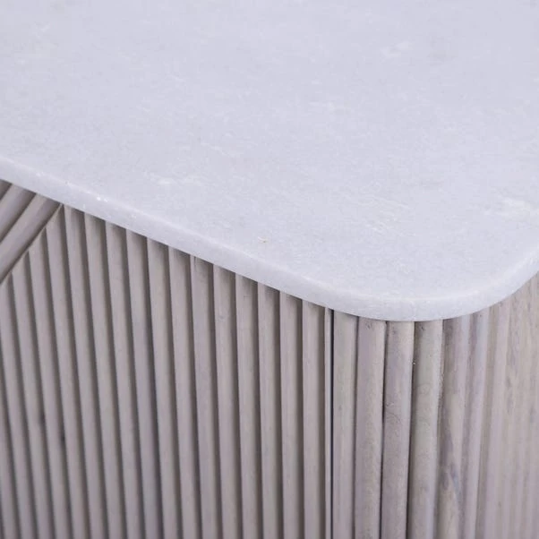 With a perfect blend of style and practicality, the Cleo 3-Door Sideboard offers ample storage while enhancing the aesthetic of any space. Its solid mango wood construction is highlighted by a beautifully crafted vertical ribbed design, adding an element of texture and visual interest. Topped with smooth marble, this sideboard exudes understated luxury, while the three-door storage compartment provides an ideal solution for keeping clutter at bay.