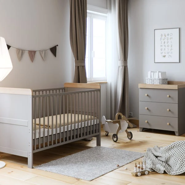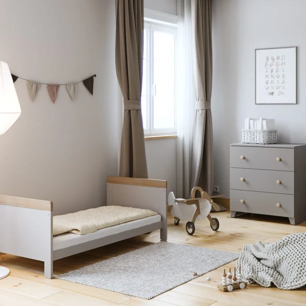 The Classic Oak Effect Cot Bed and 3 Drawer Chest Nursery Set from Little Acorns showcase a clean and contemporary look. Suitable for use from birth to approximately 4 years, the cot bed is adjustable to three mattress heights, converts into a toddler bed, and features teething rails. The accompanying dresser and changing unit offer three spacious drawers and a removable changing surround for enduring functionality.