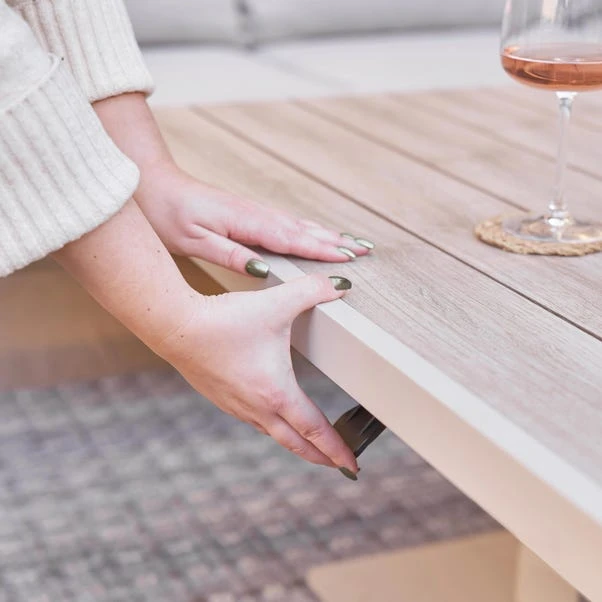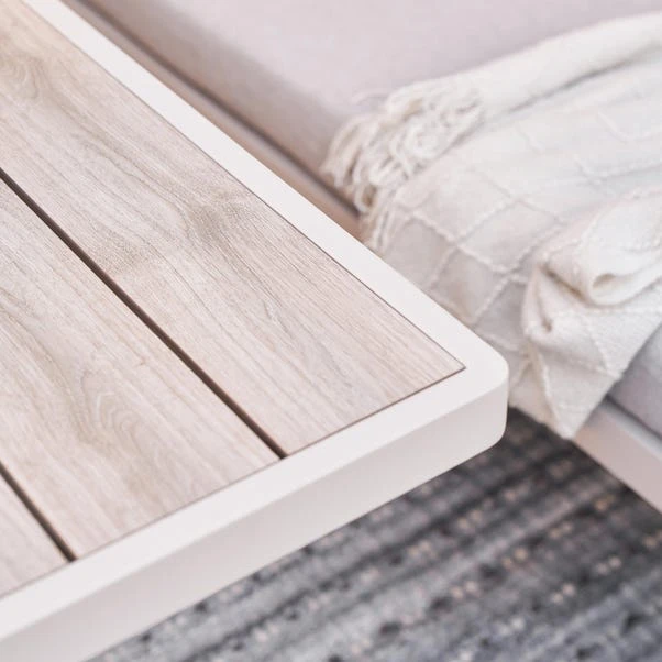 The Aruba Outdoor Corner Seating Set with Adjustable Table offers a modern and versatile lounging experience. This set includes 1 Left Arm Sofa, 1 Right Arm Sofa, 1 Adjustable Coffee Table, and 3 Footstools. Crafted from durable powder-coated aluminium, the frame is paired with season-proof cushions in Putty Olefin fabric. The adjustable coffee table features a glass top and Ash wood-effect finish, with tension springs and a gas pump for easy height adjustment. For protection, use an Aerocover when not in use. Includes a 3-Year Structural Guarantee.
