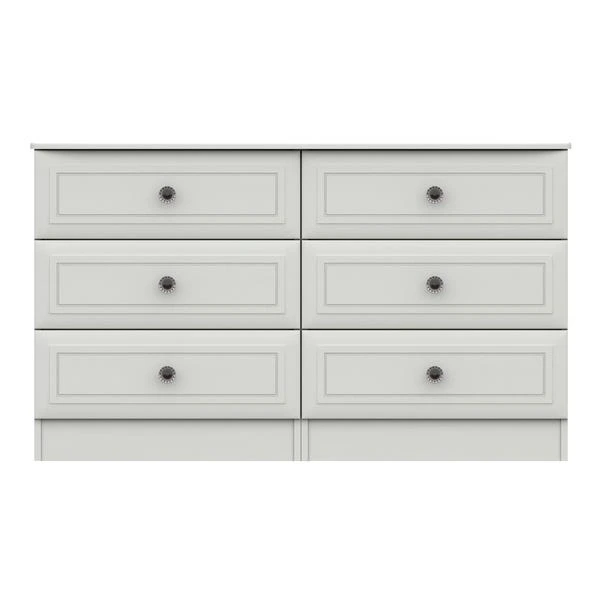 The Portia 6 Drawer Wide Chest offers a stunning timeless design, perfect for enhancing any bedroom space. This stylish chest of drawers offers a traditional styling, with its elegant bevelled edge profile drawer fronts with beautiful crystal look handles. Supplied fully assembled for convenience, the Portia comes with six spacious drawers, complete with 8mm heavy duty bases, linen look insides and easy glide metal runners.