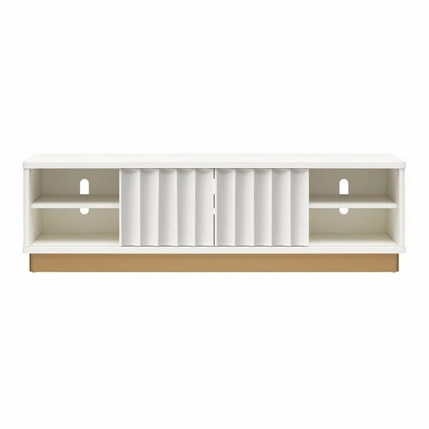 With its white faux marble surface and glossy finish, this stand complements any modern décor. The horizontal sliding doors open smoothly to reveal spacious storage for all your TV accessories, while built-in wire management keeps cords organised.