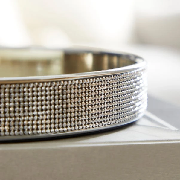 Perfect for adding a glamourous touch to your home, this mirrored tray features a diamante strip for a stylish and stunning touch. Perfect for storing candles, jewelry, and more this tray can fit into any home decor.