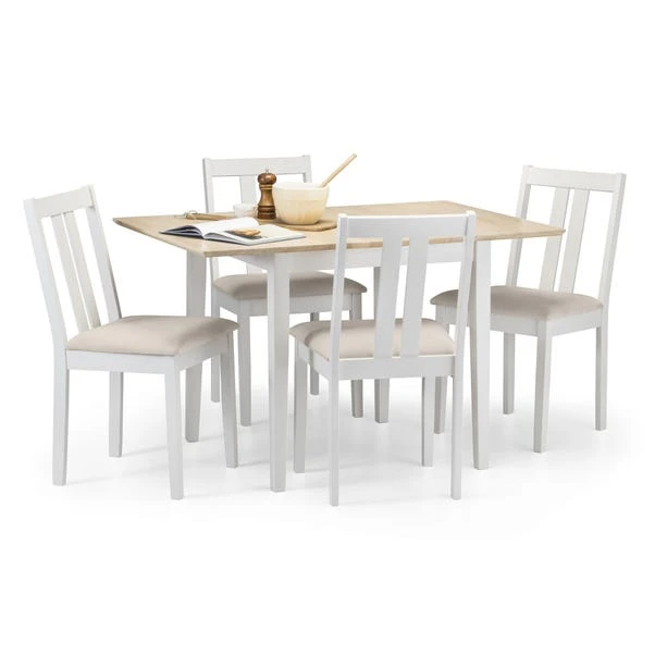 Save space in style, suitable for those with smaller dining areas, this dining set is the perfect mix of contemporary and classic dining. With a butterfly extending leaf this table extends from 80cm to 120cm. Constructed from tropical hardwood, this set has a natural lacquered finish to enhance the distinct pattern of the wood’s natural grain. This set includes suede chairs that are stylish and durable.