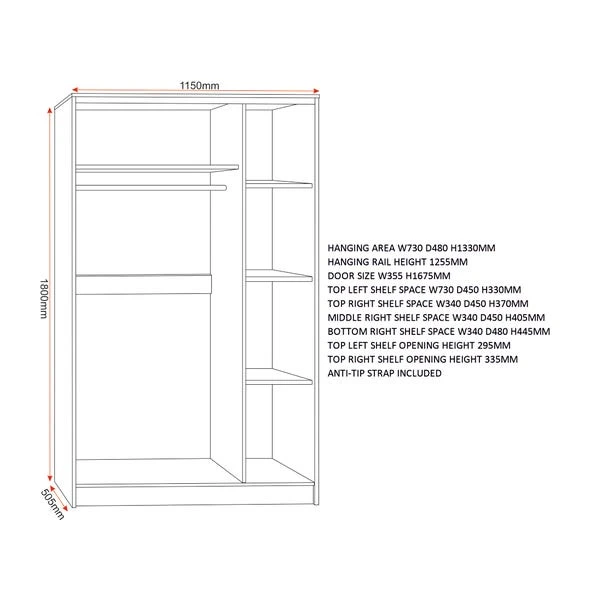 Wardrobe: H 180cm x W 115cm x D 50.5cm