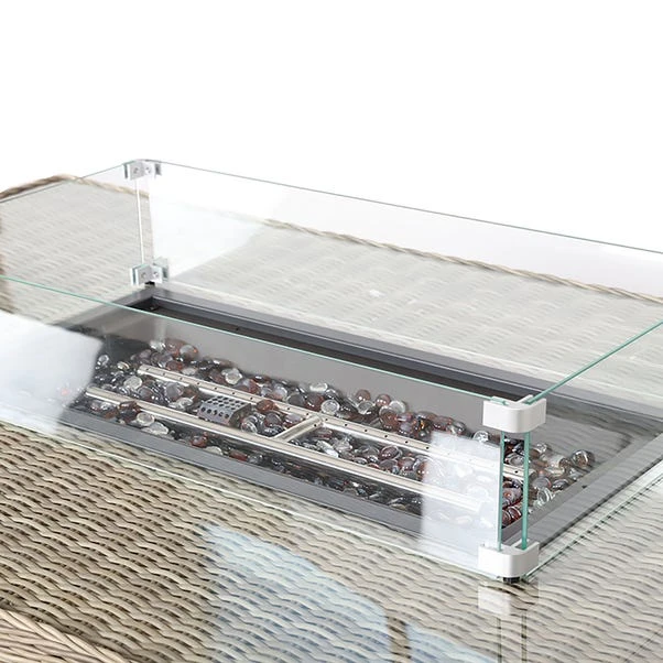 - Set includes: 1 x rectangle fire pit table, 1 x left hand sofa, 1 x right hand sofa, 1 x corner chair, 1 x middle chair and 1 x bench